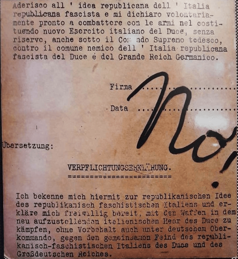 "Aderisco all'idea repubblicana dell'Italia repubblicana fascista e mi dichiaro volontariamente pronto a combattere con le armi nel costituendo nuovo Esercito italiano del Duce, senza riservo, anche sotto il Comando Supremo tedesco, contro il comune nemico dell'Italia repubblicana fascista del Duce e del Grande Reich Germanico"